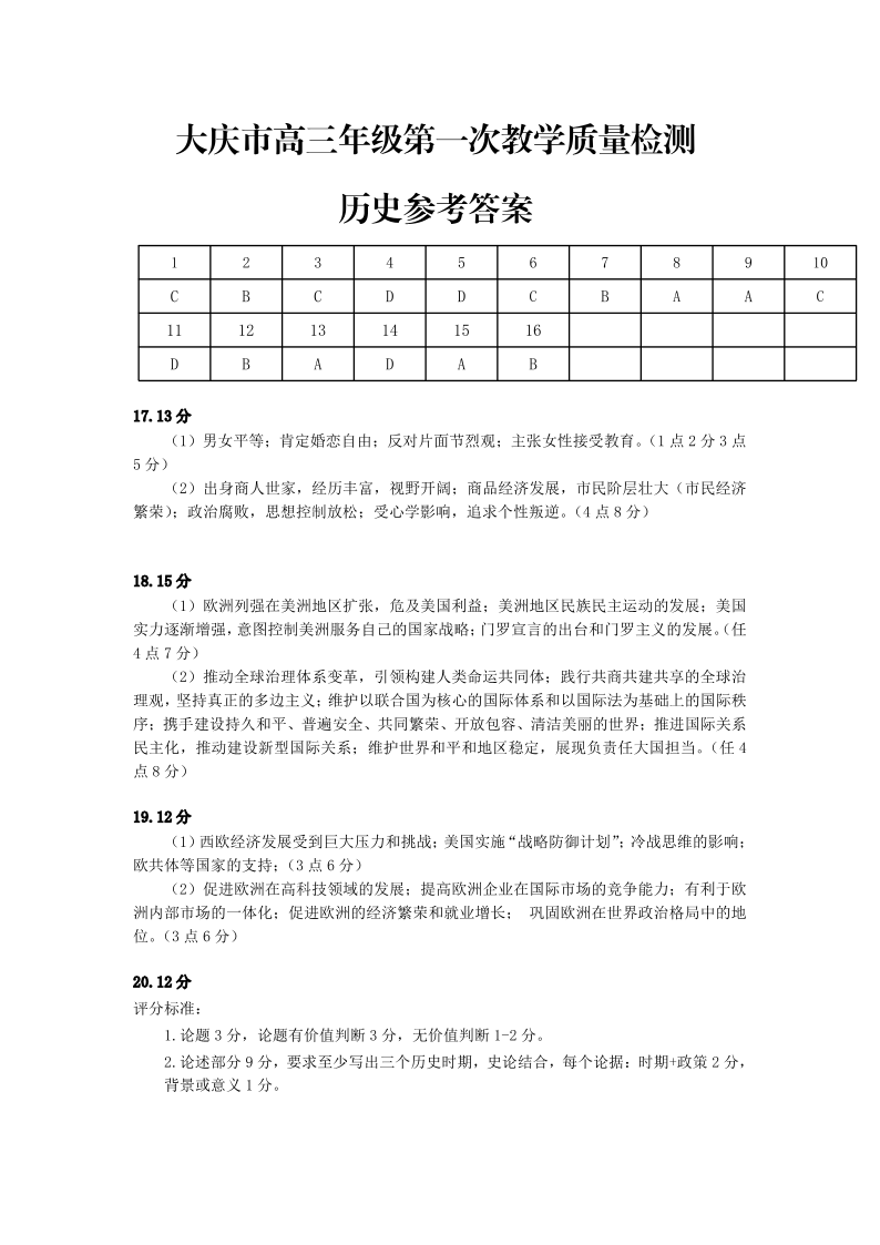 大庆市2025届高三年级第一次教学质量检测 历史答案