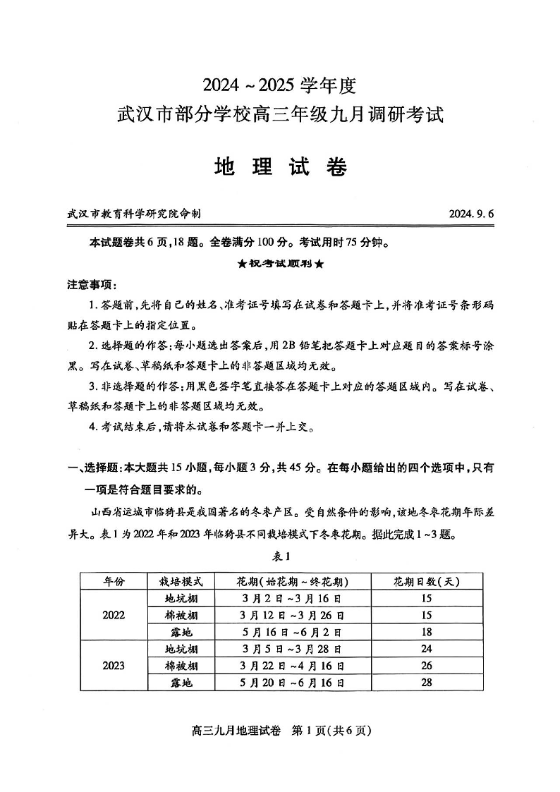 湖北省2024-2025学年度武汉市高三年级九月调研考试 地理
