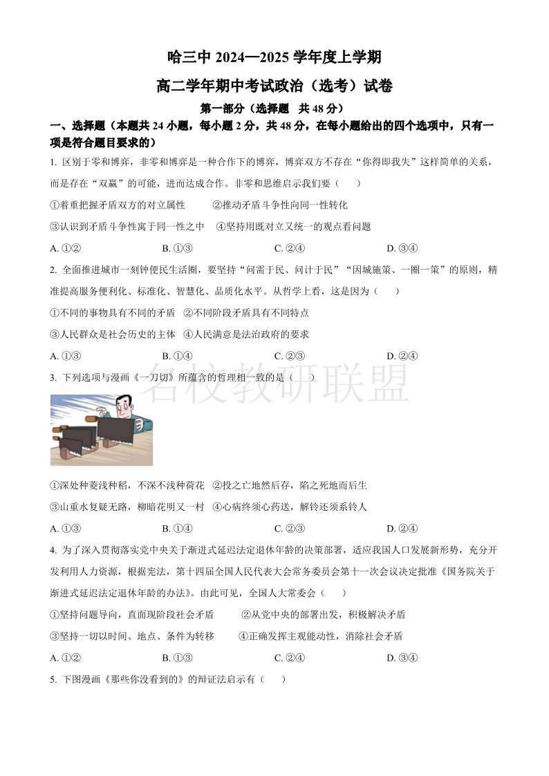 哈三中2024-2025学年度上学期高二学年期中考试 政治