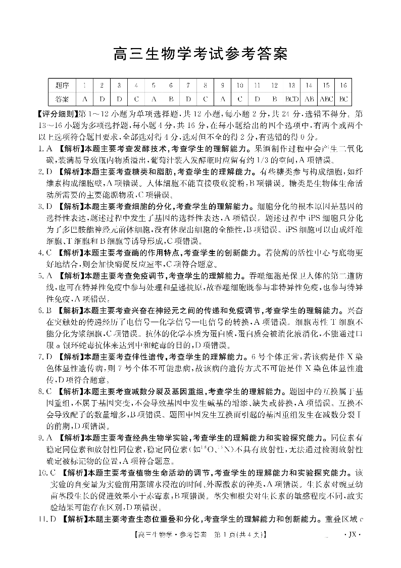 金太阳·江西省2026届高三上学期8月百万大联考 生物答案.pdf