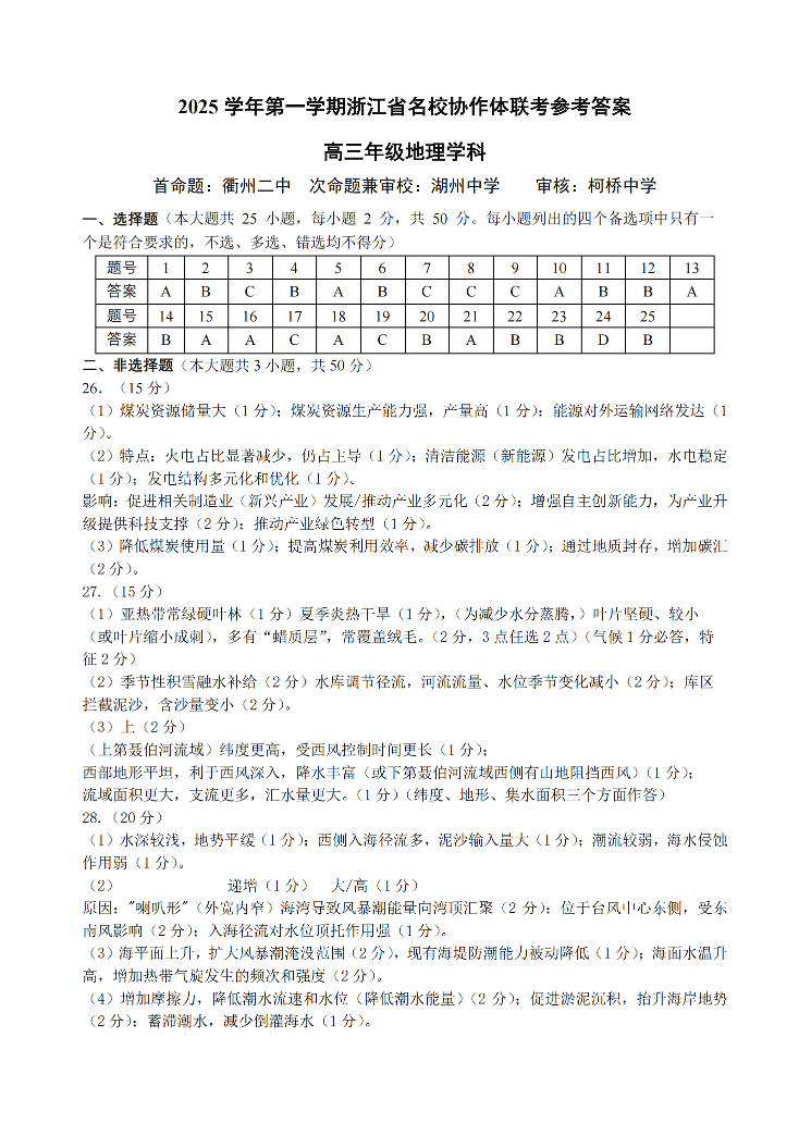 G12名校协作体2025学年第一学期高三9月暑假返校考 地理答案.pdf