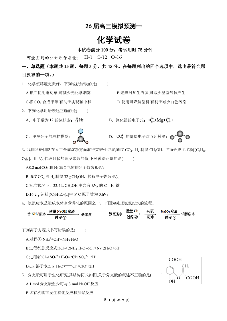 26届高三模拟预测一化学.docx