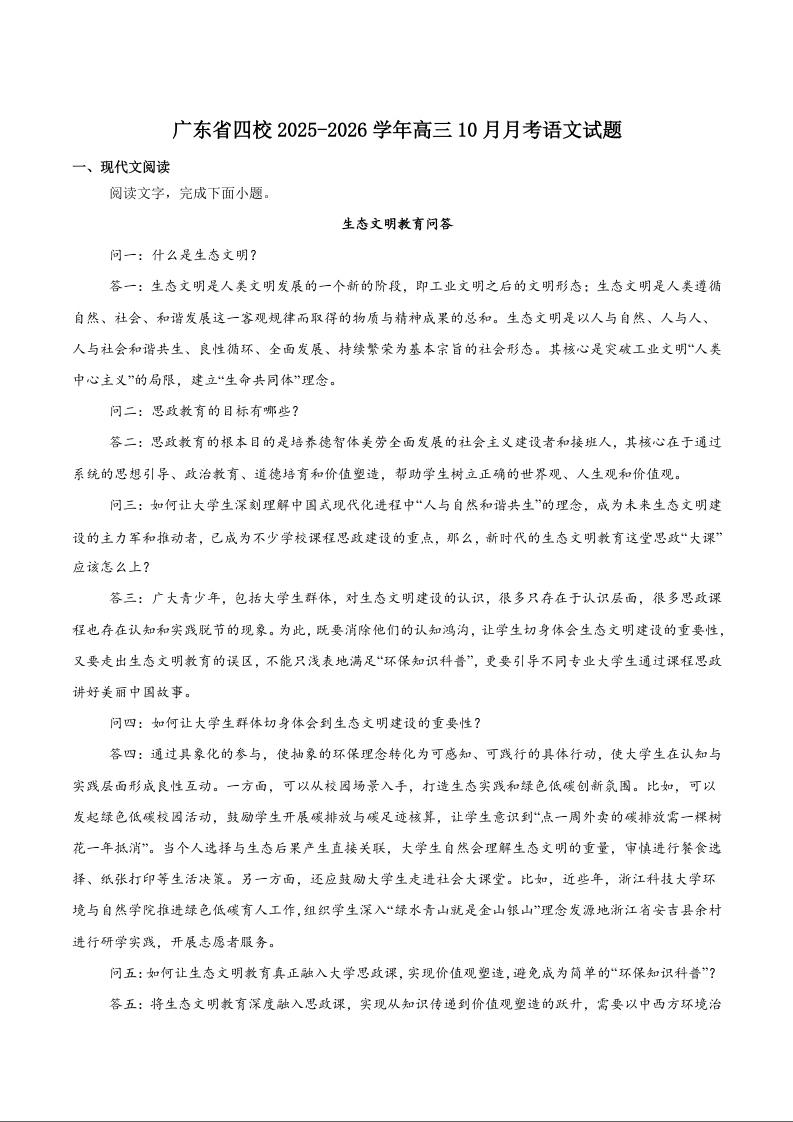 广东省四校2026届高三上学期10月教学质量检测试题 语文试卷(含答案).docx
