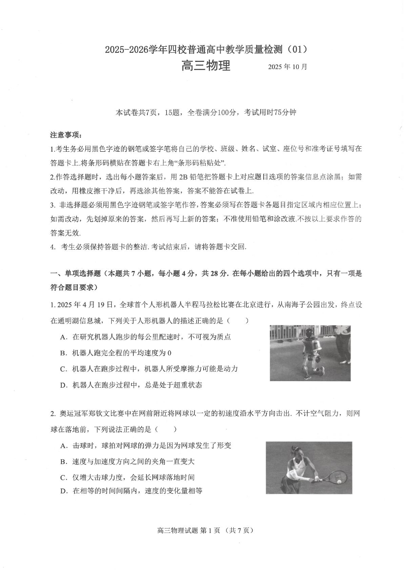 广东省四校2026届高三上学期10月教学质量检测试题 物理试卷(含答案).pdf