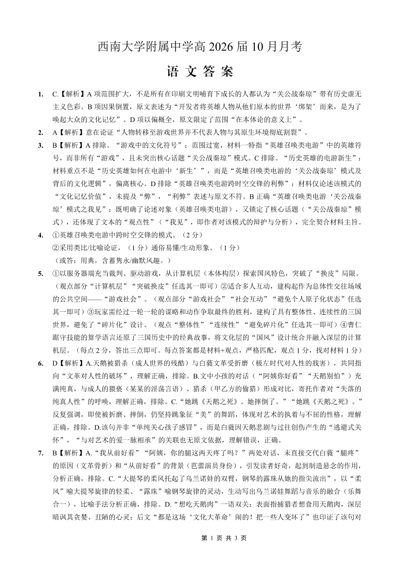 西南大学附属中学高2026届高三10月月考 语文答案.pdf