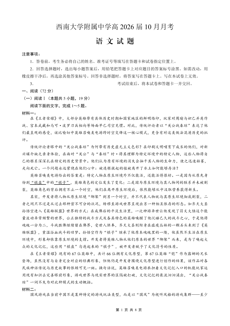 西南大学附属中学高2026届高三10月月考 语文.pdf
