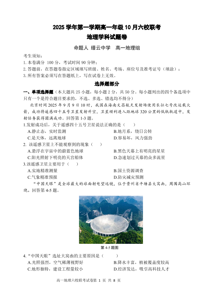 2025学年第一学期高一年级10月六校联考 地理.pdf