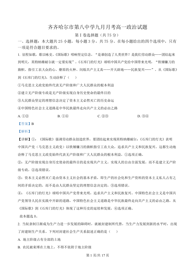 黑龙江省齐齐哈尔市第八中学校2025-2026学年高一上学期9月月考 政治答案.docx