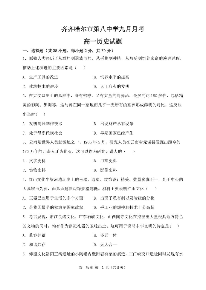 黑龙江省齐齐哈尔市第八中学校2025-2026学年高一上学期9月月考 历史.pdf
