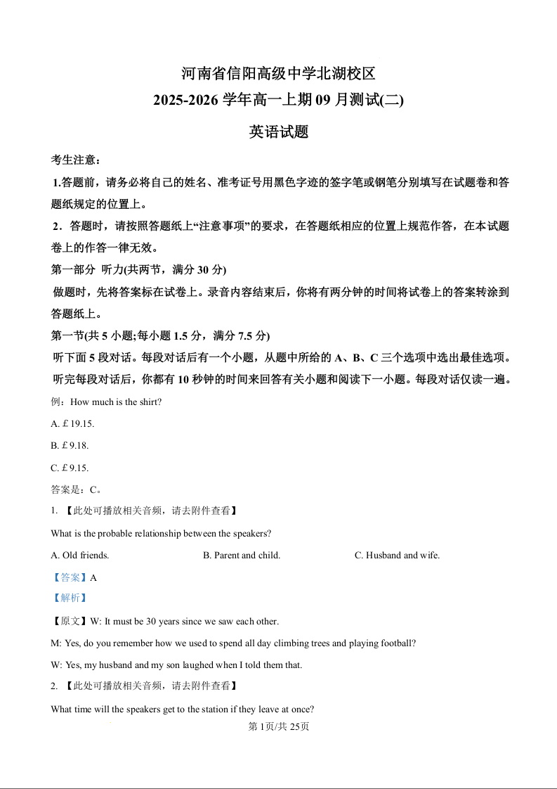 河南省信阳市信阳高级中学2025-2026学年高一上学期9月测试(二)英语答案.docx