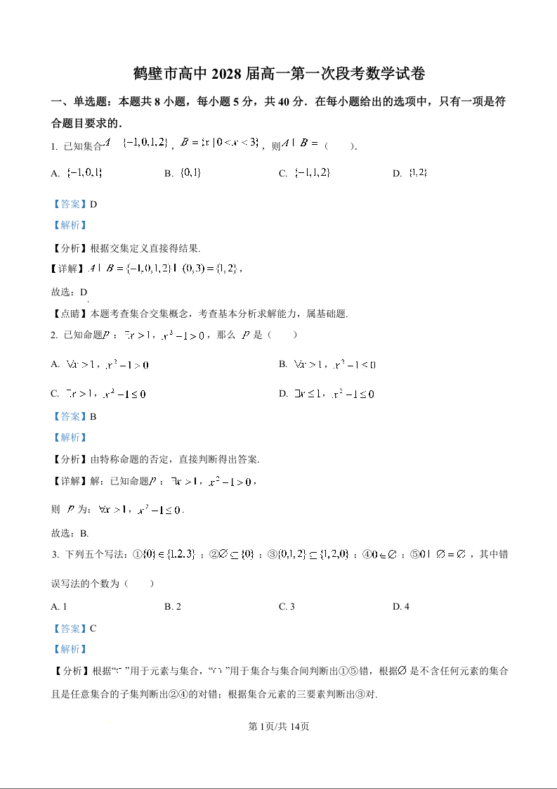 河南省鹤壁市高中2025-2026学年高一上学期第一次段考 数学答案.docx