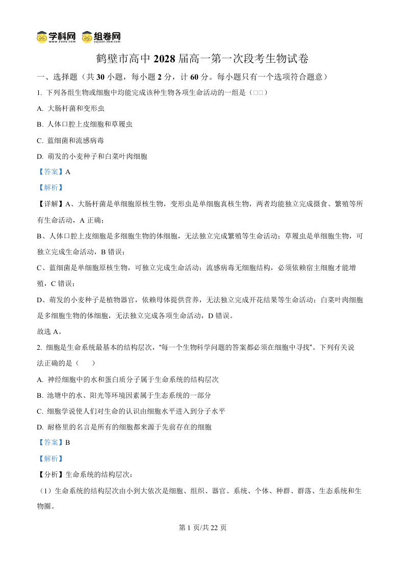 河南省鹤壁市高中2025-2026学年高一上学期第一次段考 生物答案.docx