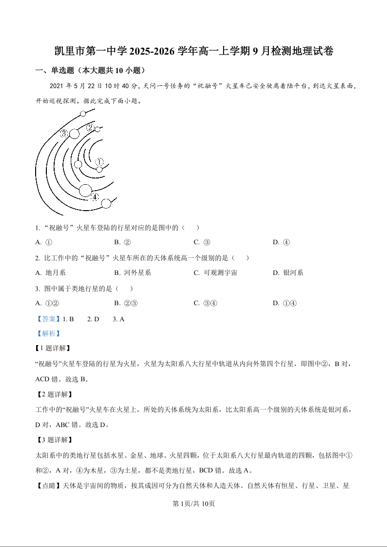 贵州省凯里市第一中学2025-2026学年高一上学期9月检测 地理答案.docx