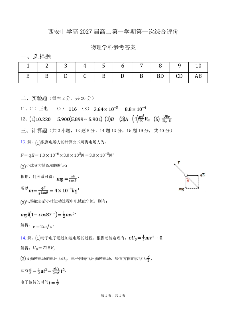 陕西省西安中学2025-2026学年高二上学期第一次综合评价 物理答案.docx
