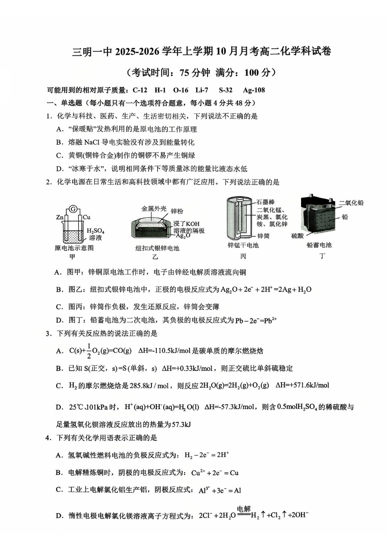 福建省三明第一中学2025-2026学年高二上学期10月月考 化学试题(含答案).pdf