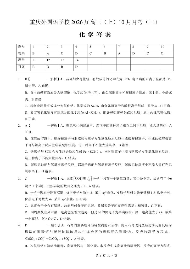 重庆外国语学校高2026届高三(上)10月月考(三)化学答案.pdf