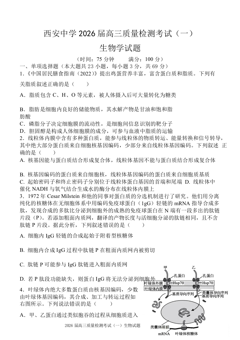 陕西省西安中学2026届高三上学期10月质量检测考试(一)生物.docx