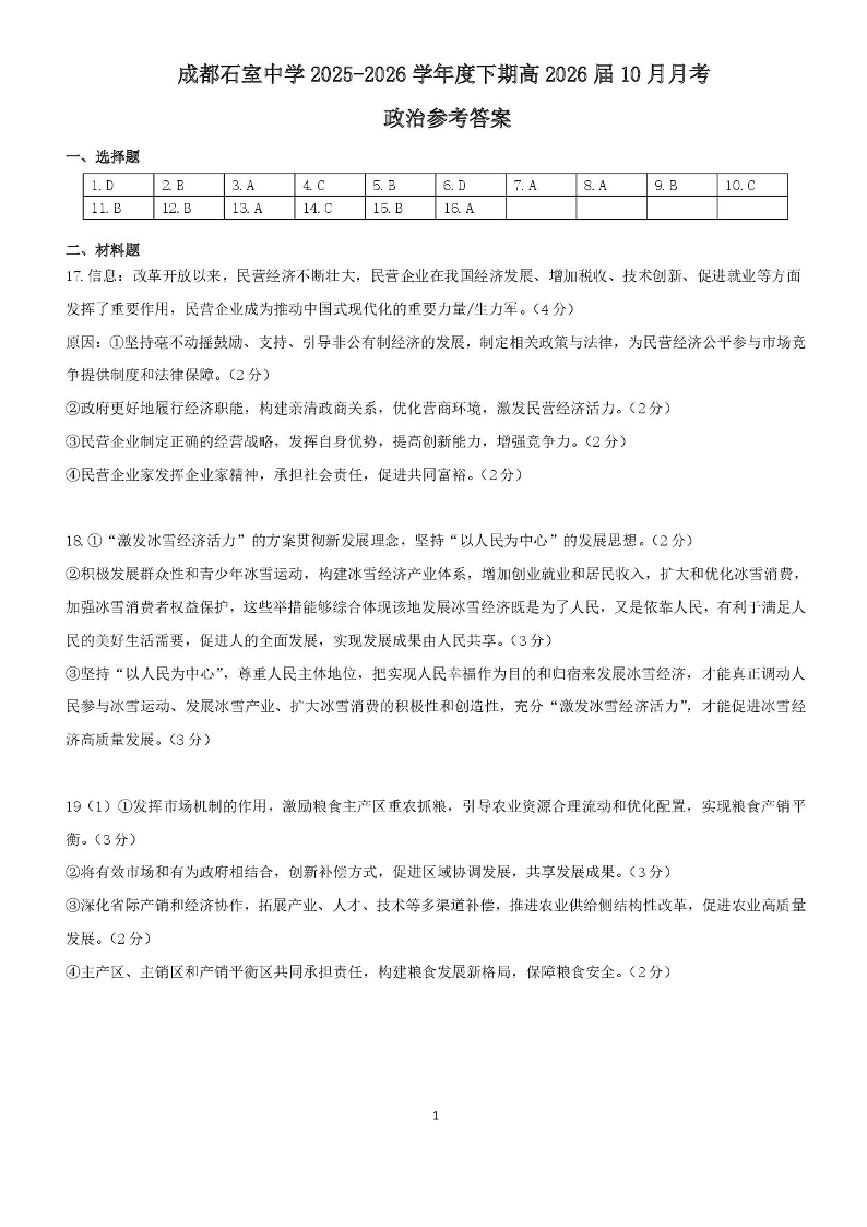 四川省成都市石室中学2025-2026学年高三上学期10月月考 政治答案.pdf
