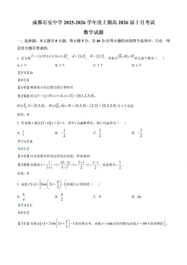 四川省成都市石室中学2025-2026学年高三上学期10月月考 数学答案.pdf
