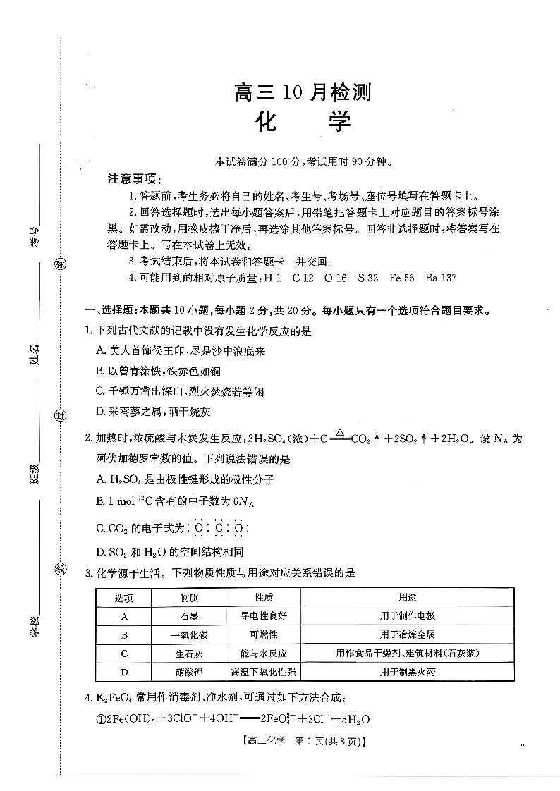 百校大联考2025-2026学年高三上学期10月检测 化学试题(含答案).pdf