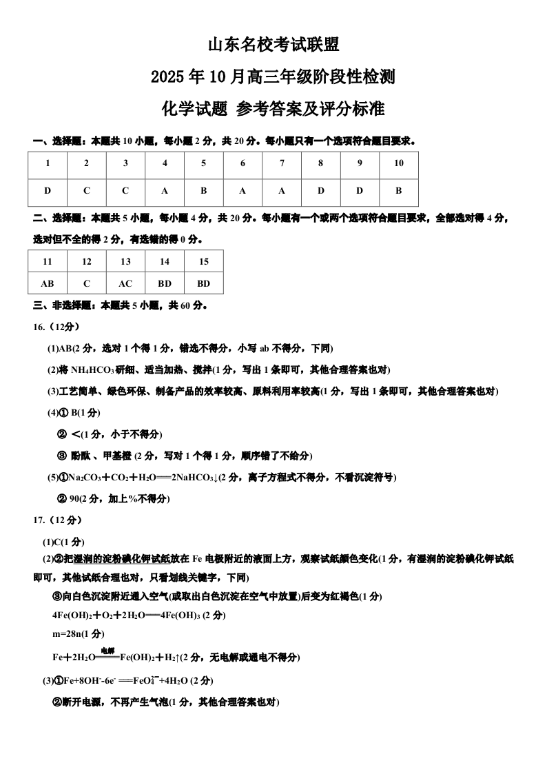 山东名校考试联盟2025年10月高三年级阶段性检测 化学答案.pdf