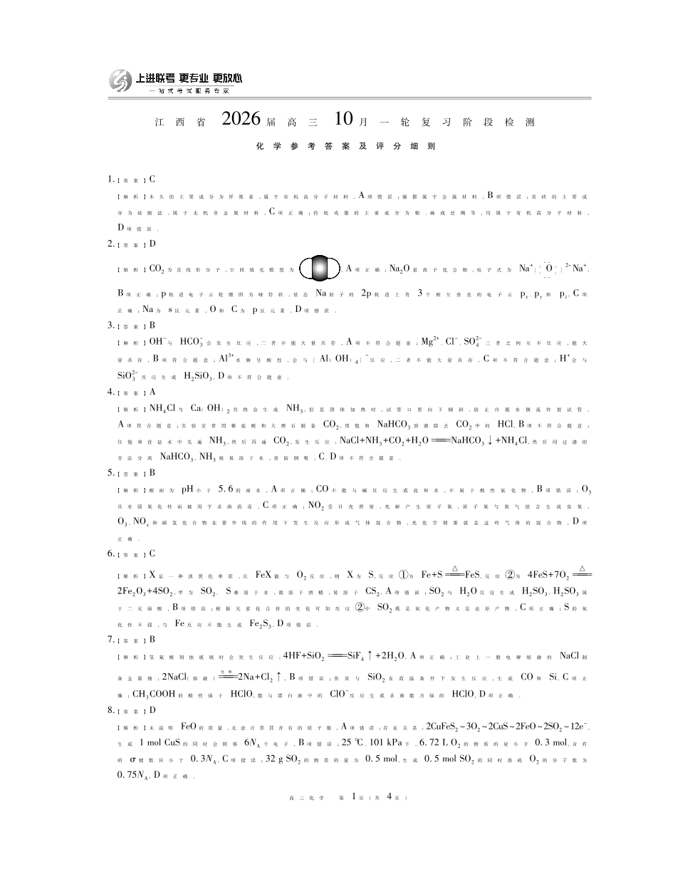 江西省2026届高三10月一轮复习阶段检测 化学答案.pdf