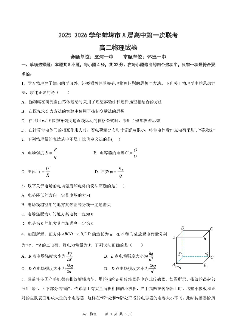 安徽省蚌埠市A层高中2025-2026学年高二上学期10月月考 物理试题(含答案).pdf