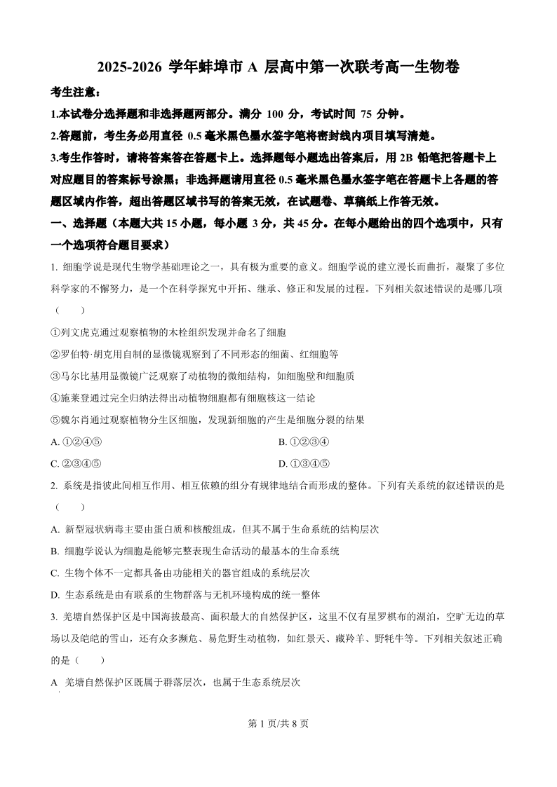 安徽省蚌埠市A层高中2025-2026学年高一上学期10月月考 生物.pdf