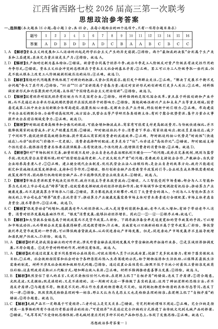 江西省西路七校2026届高三第一次联考 政治答案.pdf