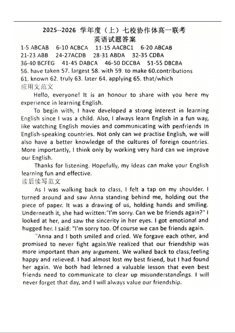2025-2026 学年度(上)七校协作体高一联考 英语答案.docx