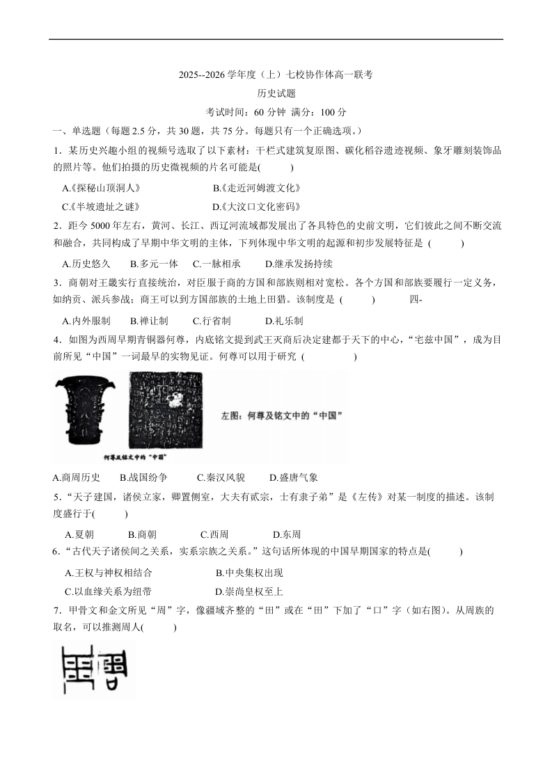 2025-2026 学年度(上)七校协作体高一联考 历史.docx