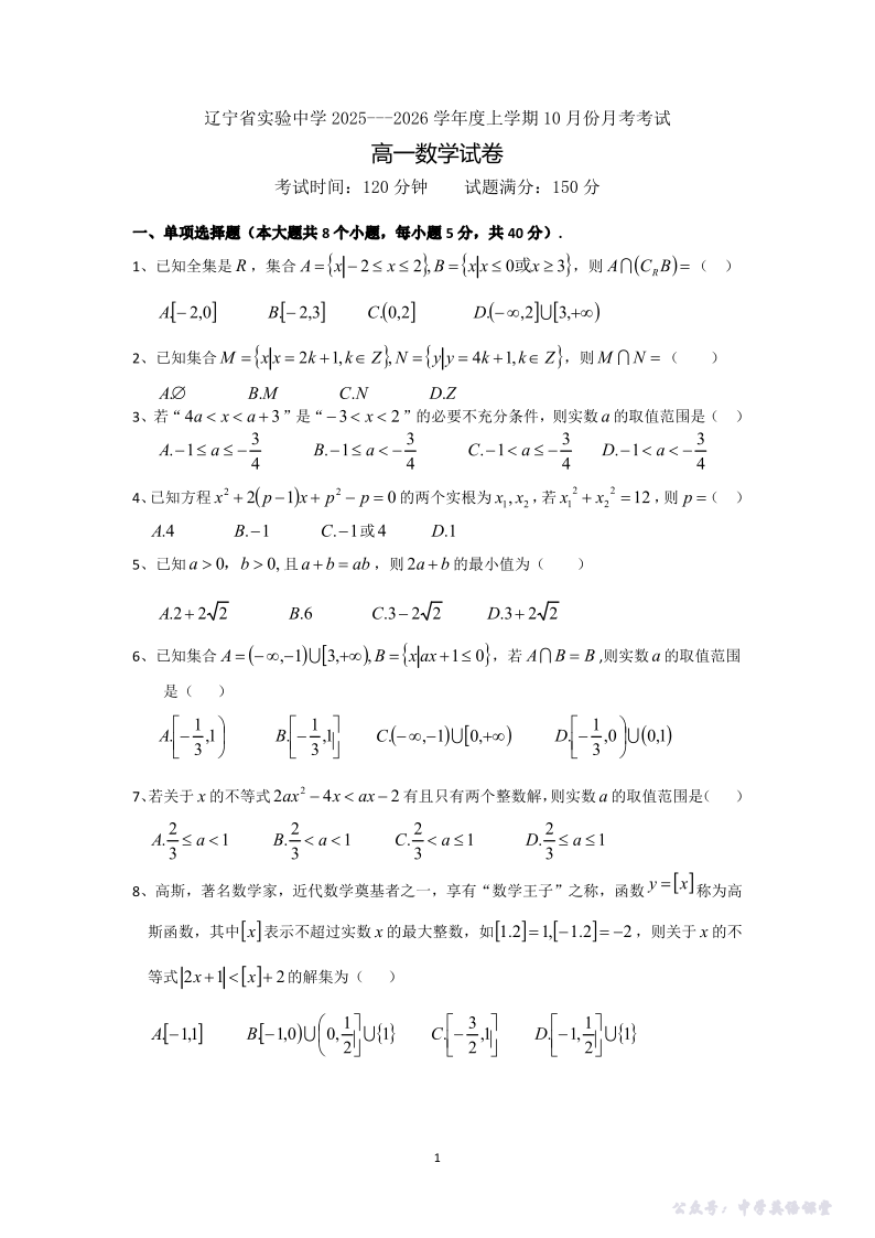 辽宁省实验中学2025-2026年高一上10月月考 数学.pdf