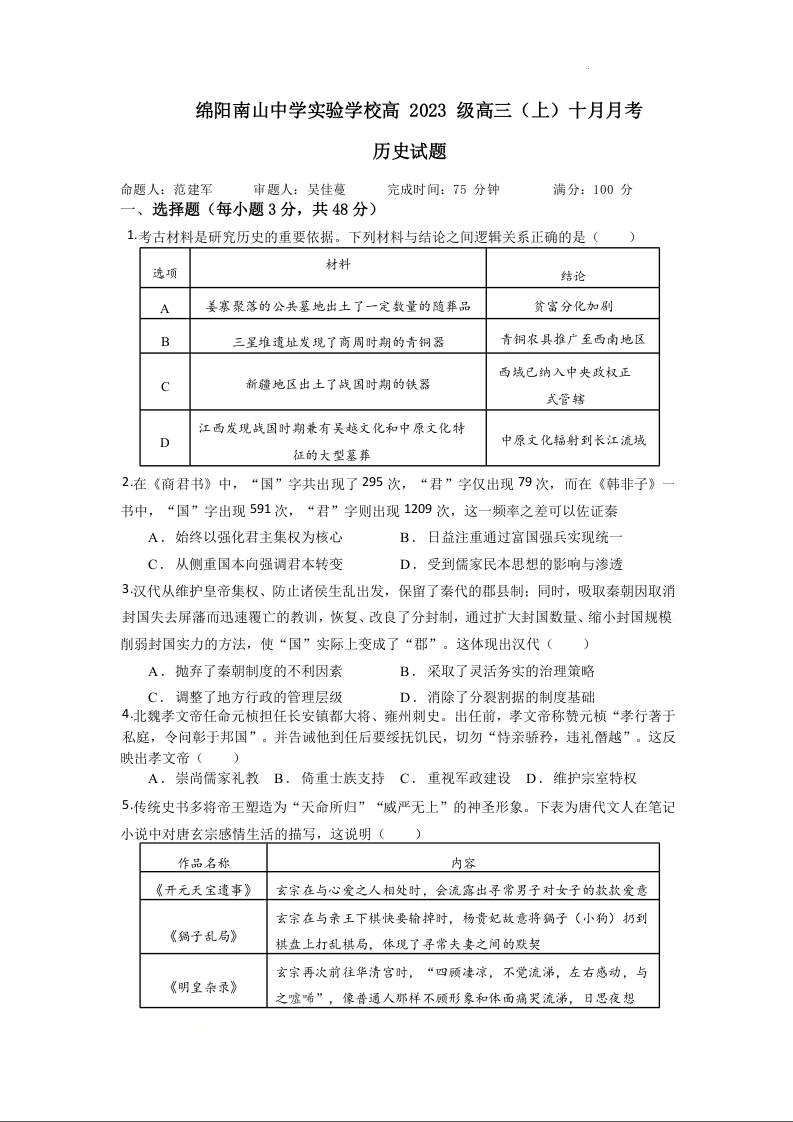 绵阳南山中学实验学校高2023级高三(上)10月月考 历史.docx