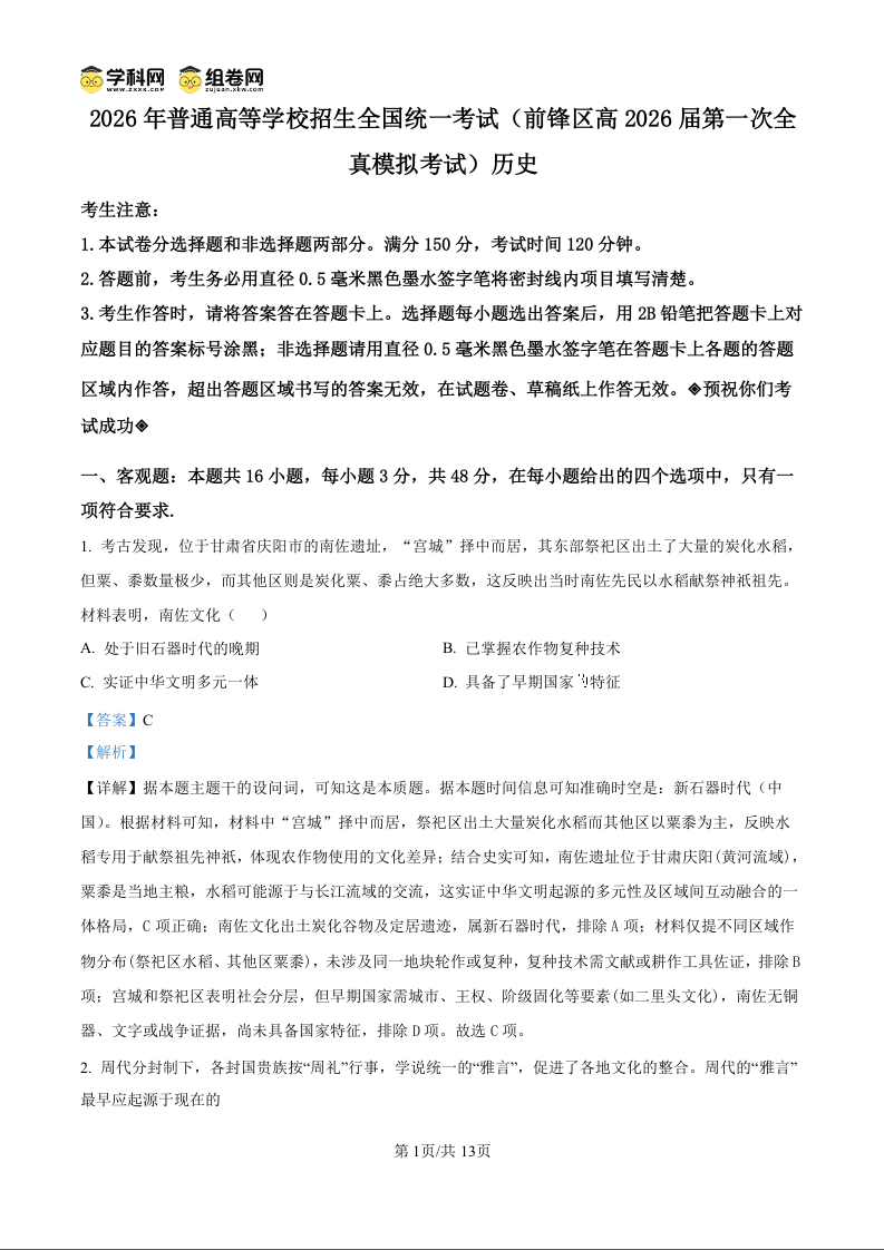 前锋区高2026届第一次全真模拟考试 历史答案.docx