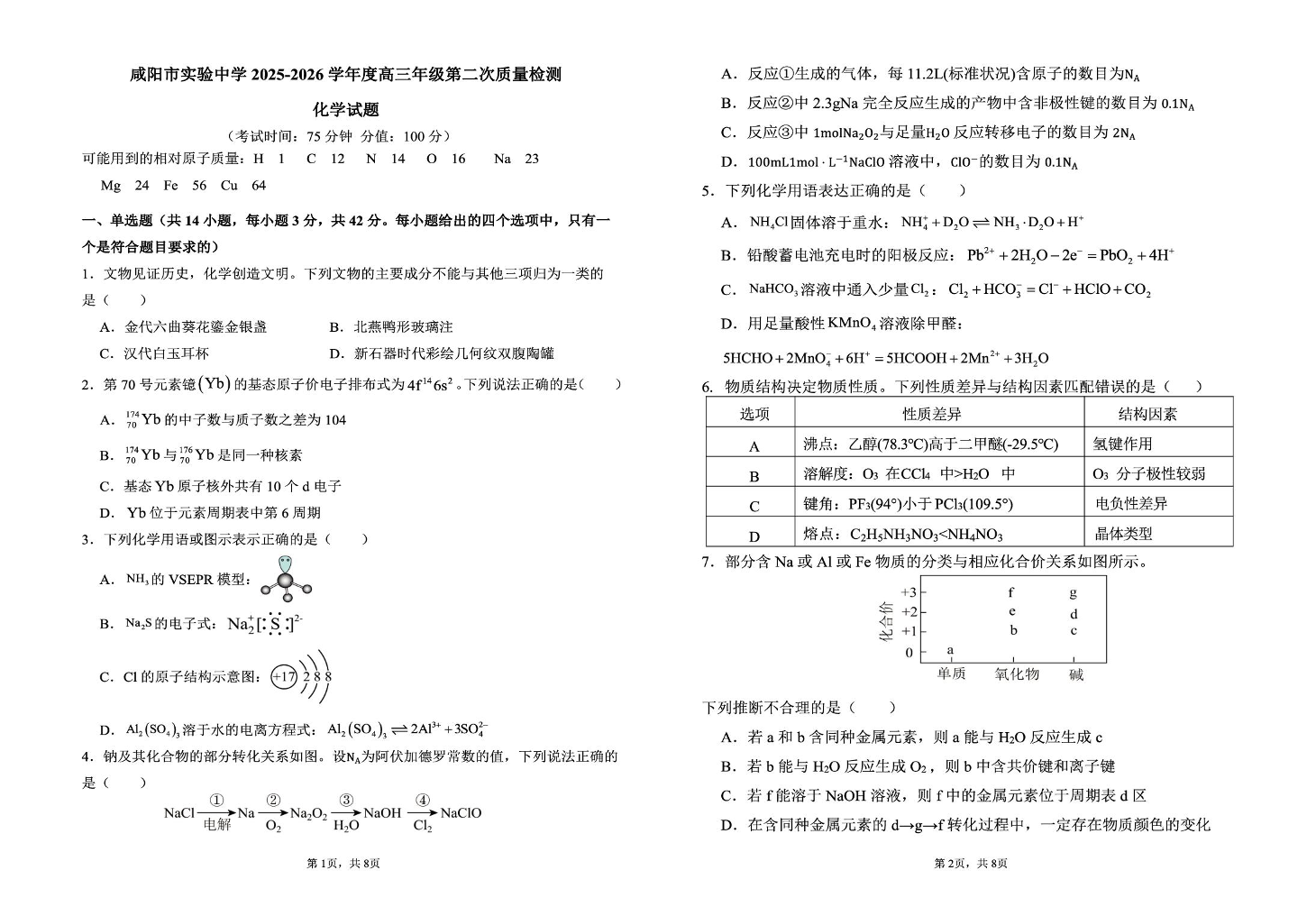 陕西省咸阳市实验中学2026届高三上学期第二次质量检测 化学.pdf