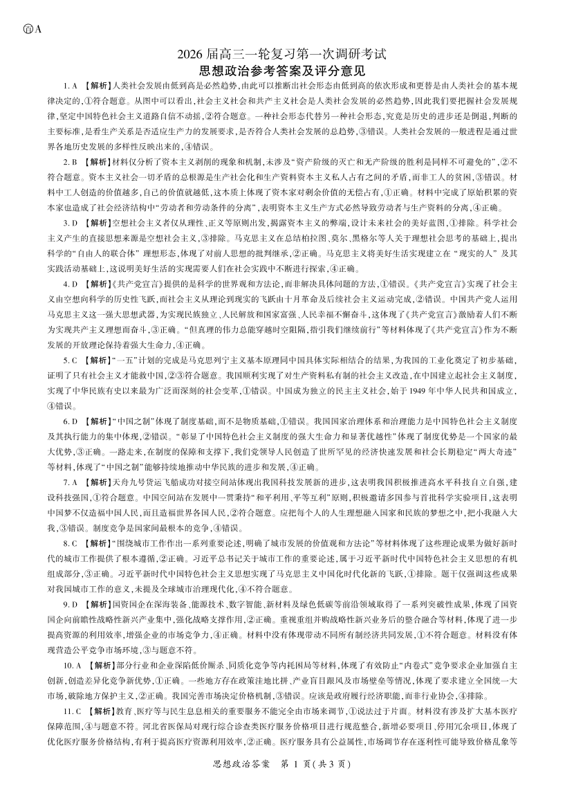 四川省百师联盟2026届高三一轮复习第一次调研考试 政治答案.pdf
