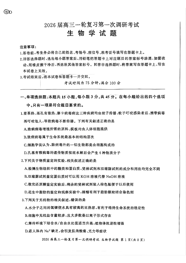 四川省百师联盟2026届高三一轮复习第一次调研考试 生物.pdf
