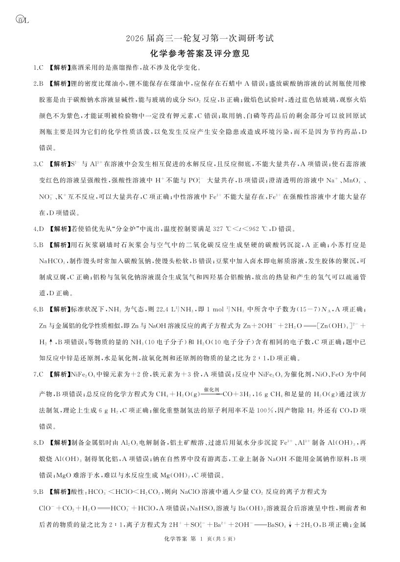 四川省百师联盟2026届高三一轮复习第一次调研考试 化学答案.pdf