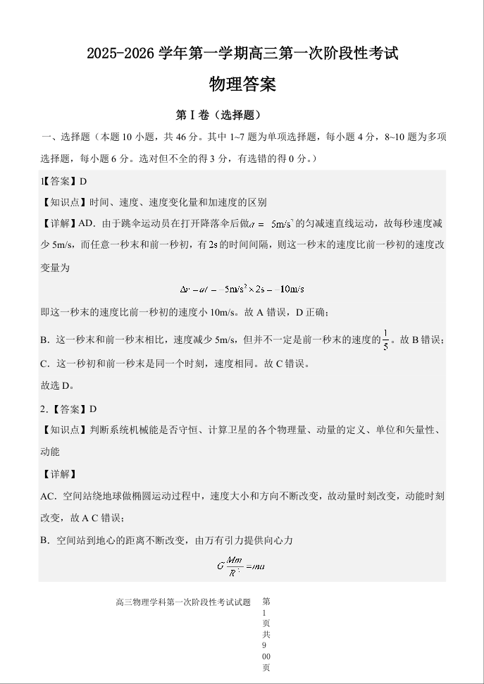 渤海大学附属高级中学2026届高三上学期第一次月考 物理答案.docx