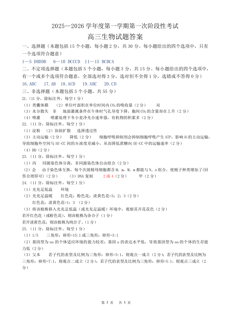 渤海大学附属高级中学2026届高三上学期第一次月考 生物答案.docx