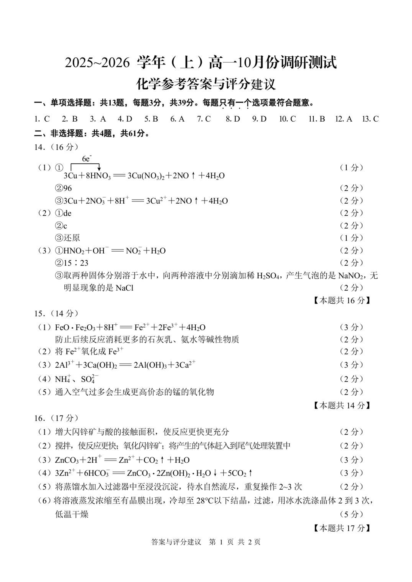 江苏省南通市2025-2026学年高一上学期10月调研测试 化学答案.pdf