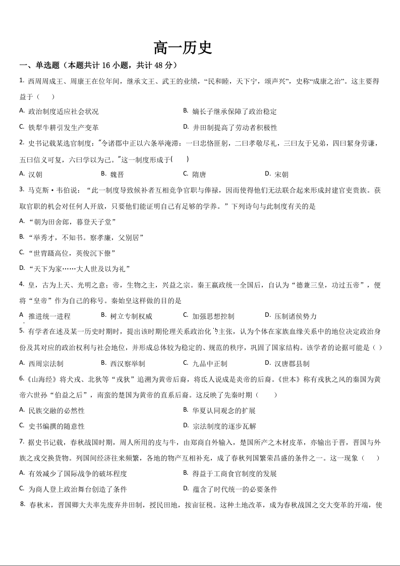 吉林省通化市梅河口市第五中学2025-2026学年高一上学期10月月考 历史试题(含答案).docx