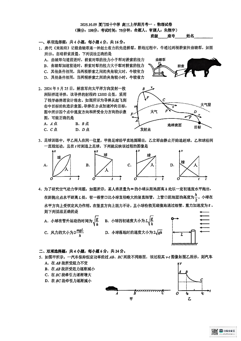 福建省厦门双十中学2026届高三(上)第一次月考 物理.pdf