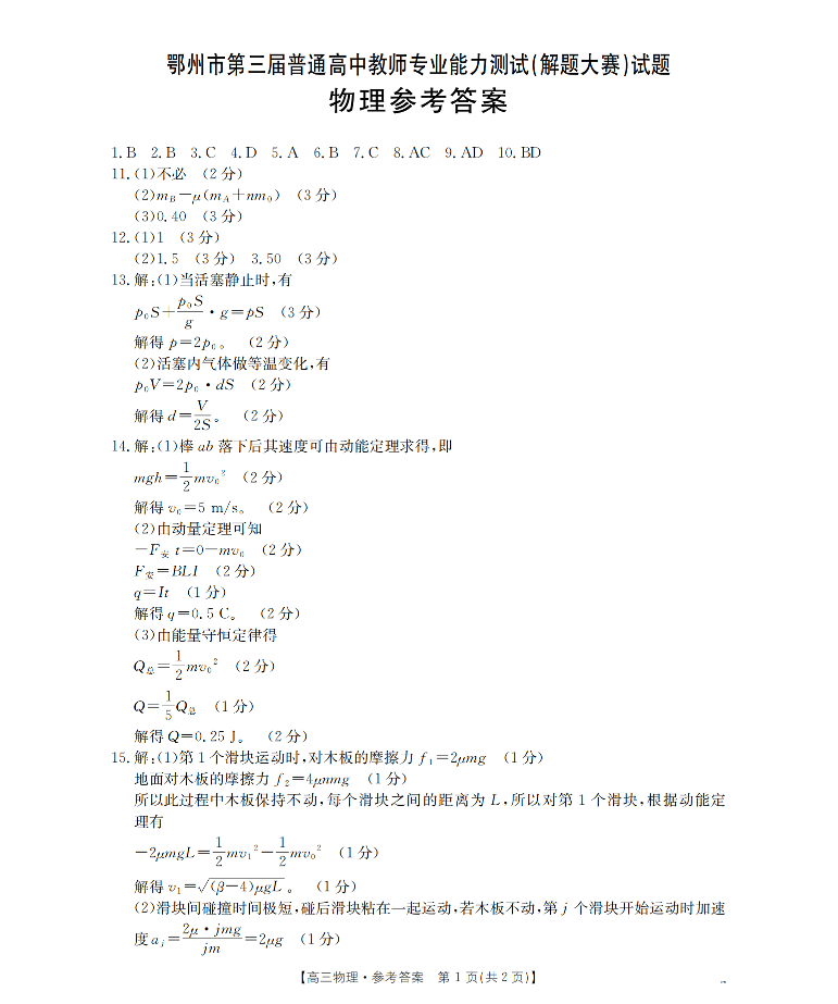 鄂州市2026届高三上学期第三届普通高中教师专业能力测试(解题大赛) 物理答案.pdf