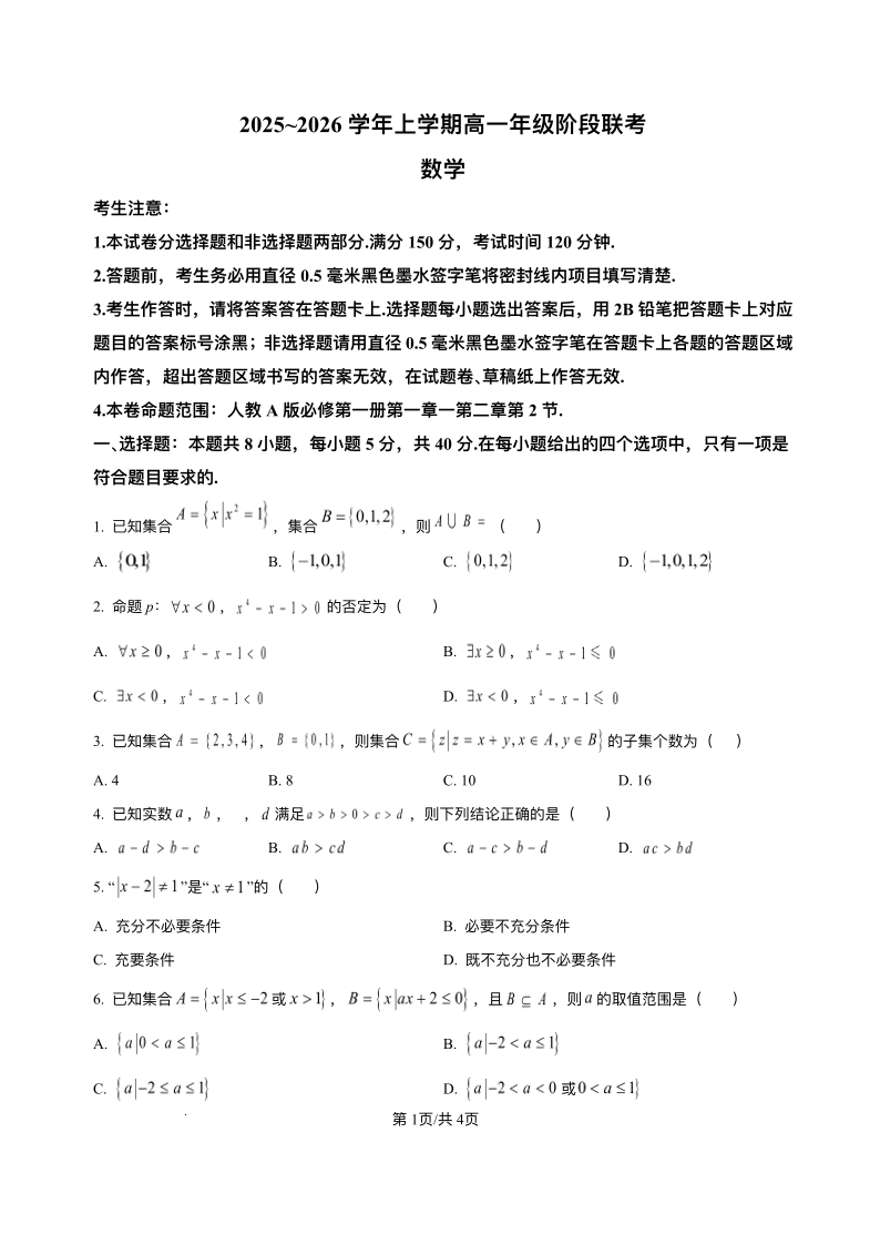 安徽省江淮名校2025-2026学年高一上学期10月阶段联考 数学试题(含答案).pdf
