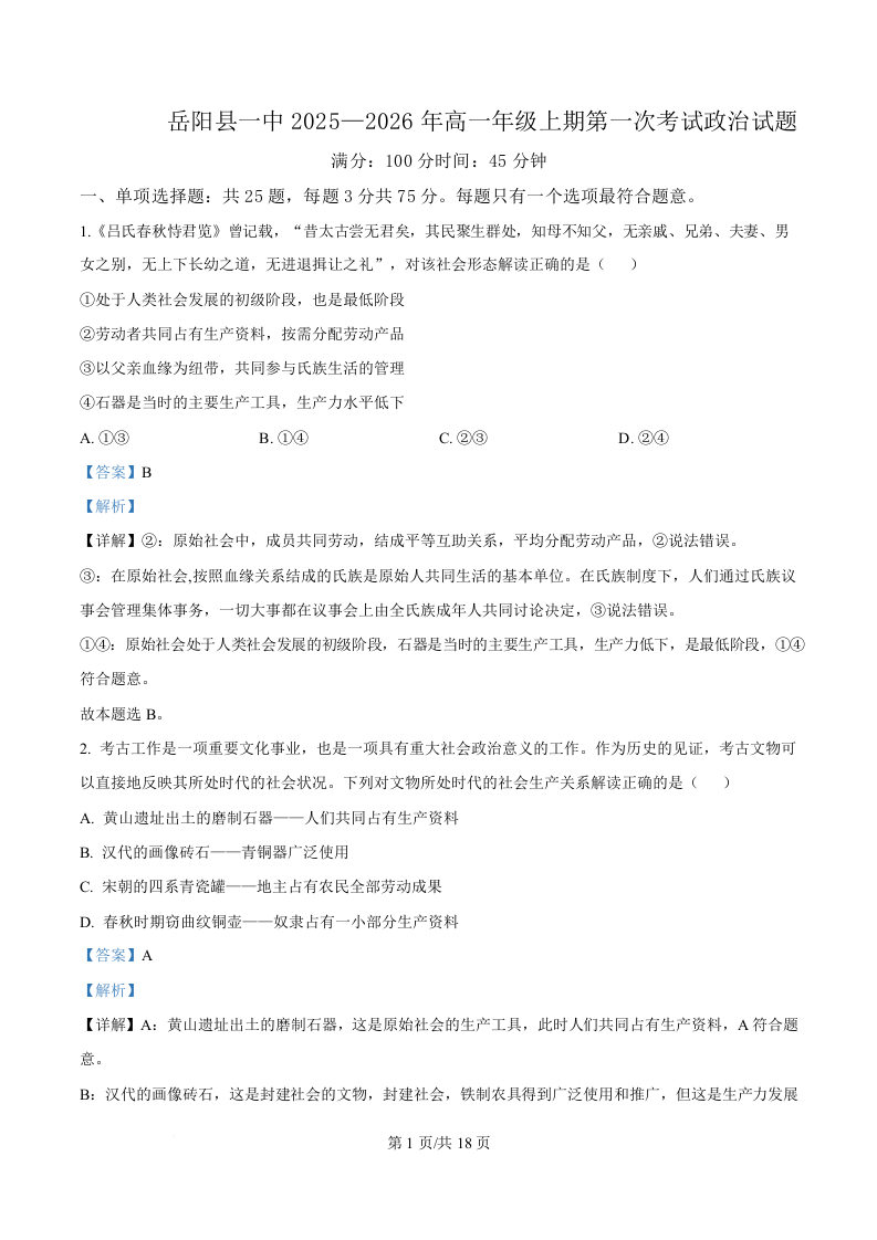 湖南省岳阳县第一中学2025-2026学年高一上学期第一次月考 政治答案.docx