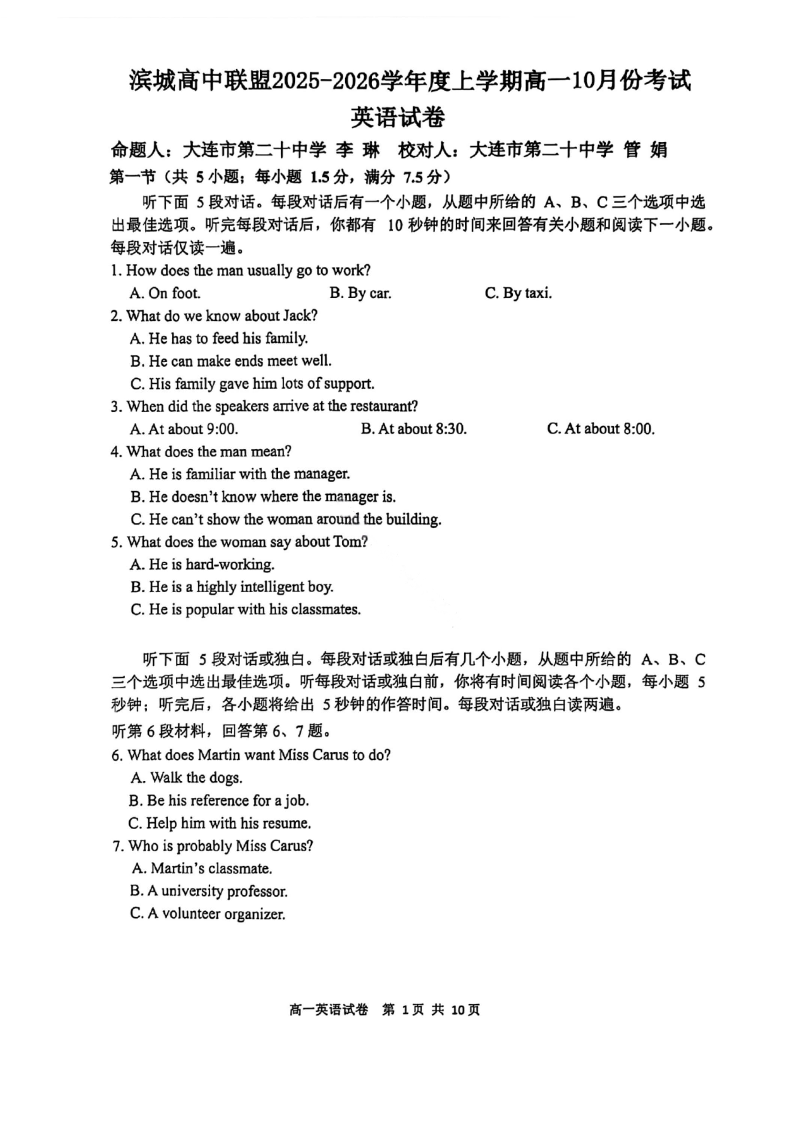 辽宁省大连市滨城高中联盟2025-2026学年度上学期高一10月份联考 英语试题(含答案).pdf