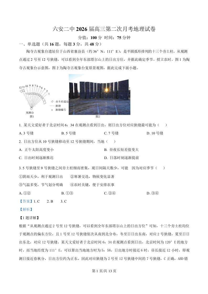 安徽省六安第二中学2026届高三上学期第二次月考 地理答案.docx