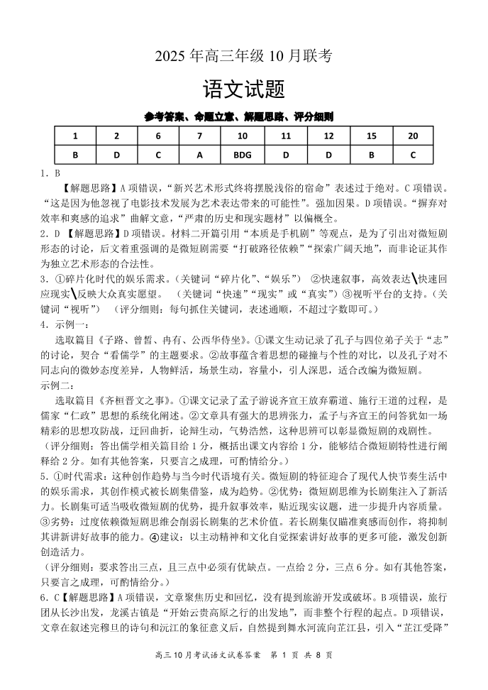 湖北省云学联盟2025年高三年级10月考试 语文答案.pdf