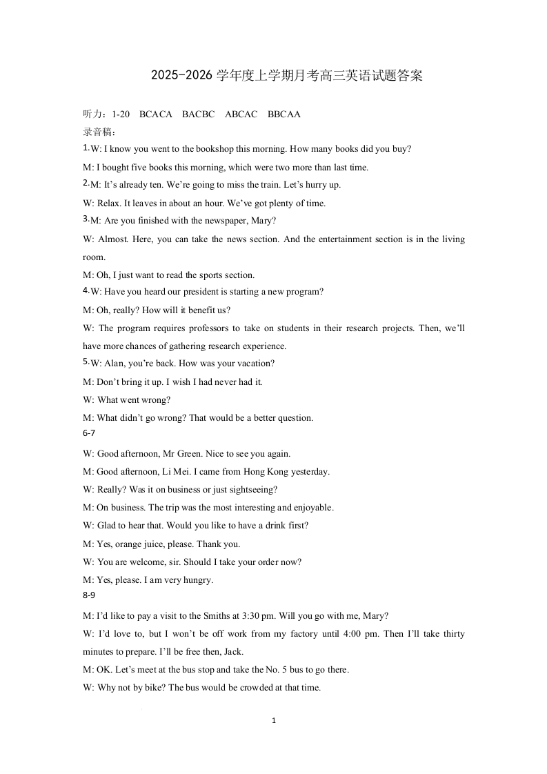吉林省长春市第二实验中学2026届高三上学期10月月考 英语答案.docx